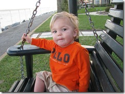I found a really good rate at a very nice hotel called the King and Prince Beach Resort. Ben decided that GCFB could live without him for a day and a half so ON Wednesday, March 7 we loaded John Brooks and enough stuff to last us a week into the car and headed up the road. After a pit stop in Jacksonville at Once Upon A Child and Charming Charlie (holy moly – this place is AH-mazing – accessory overload!) we arrived at our hotel around 5 pm. Y’all the hotel was beautiful! It’s a historic hotel that sits right on the beach and I could just imagine ladies in their big dresses and parasols gliding up and down the upstairs balcony (kind of like the scenes from Titanic where Kate Winslet and the other ladies walk around the boat). John Brooks and I took a walk around the property while Ben took a rest and we discovered the nicest area with a sidewalk and porch swings set up every few feet. John Brooks and I swung a while and walked a while and then got ready for supper. It was the sweetest thing watching JB swing and “hum” a tune.